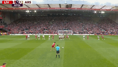 中场休息之后,利物浦加强了进攻,逐渐创造出机会。比赛的第82分钟,索博斯洛伊主罚前场中路任意球左脚劲射破门,1比0!