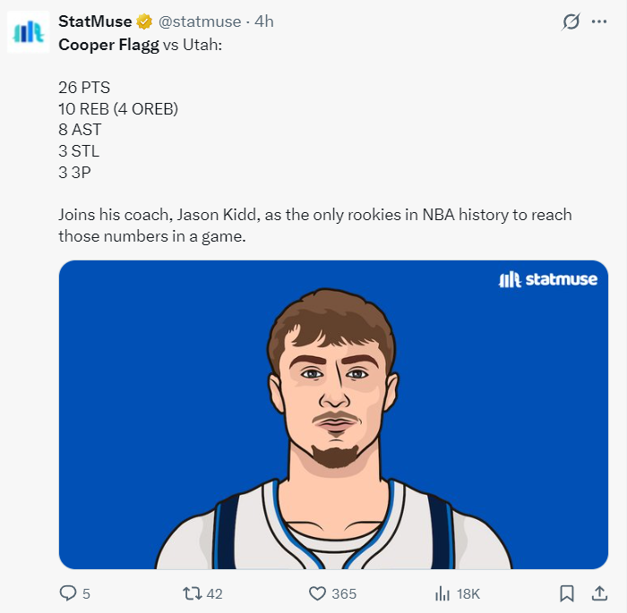 库珀-弗拉格是独行侠唯一的非卖品,他本场比赛的个人表现是非常出色的,全场比赛38分钟,18中10,三分6中3,罚球4中3,拿到26分10篮板8助攻3抢断1盖帽,命中率55.6%,三分命中率50%,弗拉格的个人表现没有受到外界的流言侵扰,因为不管球队怎么变他都是未来的建队基石。