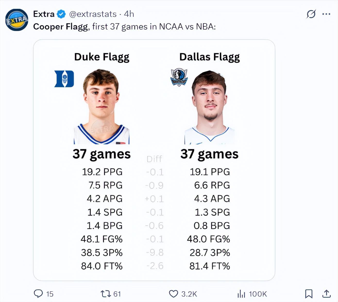 数据媒体晒出了弗拉格杜克大学前37场比赛与NBA前37场的数据对比,这个差距非常之效,NBA场均19.1分6.6篮板4.3助攻1.3抢断0.8盖帽,命中率48%,三分命中率28.7%。